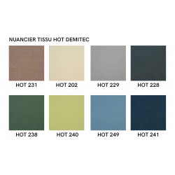 Revêtement TISSU HOT (gamme C), un matériau en tissu 100% PES FR, résistant aux abrasions, résistant eu feu, résistant aux UV. Pour l'entretien, nous conseillons un chiffon doux pour le nettoyage quotidien de la poussière. En cas de tâche, munissez vous d'un chiffon blanc, trempé dans de l'eau tiède et un peu de savon de Marseille, frotter délicatement en cercle concentrique et laisser séchez. Nous vous conseillons également d'imperméabiliser votre siège pour une protection au quotidien optimale.