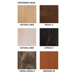 Le piétement est en métal peint époxy disponible blanc ou noir et le dossier est en bois de hêtre teinté, disponibles dans plusieurs teintes.